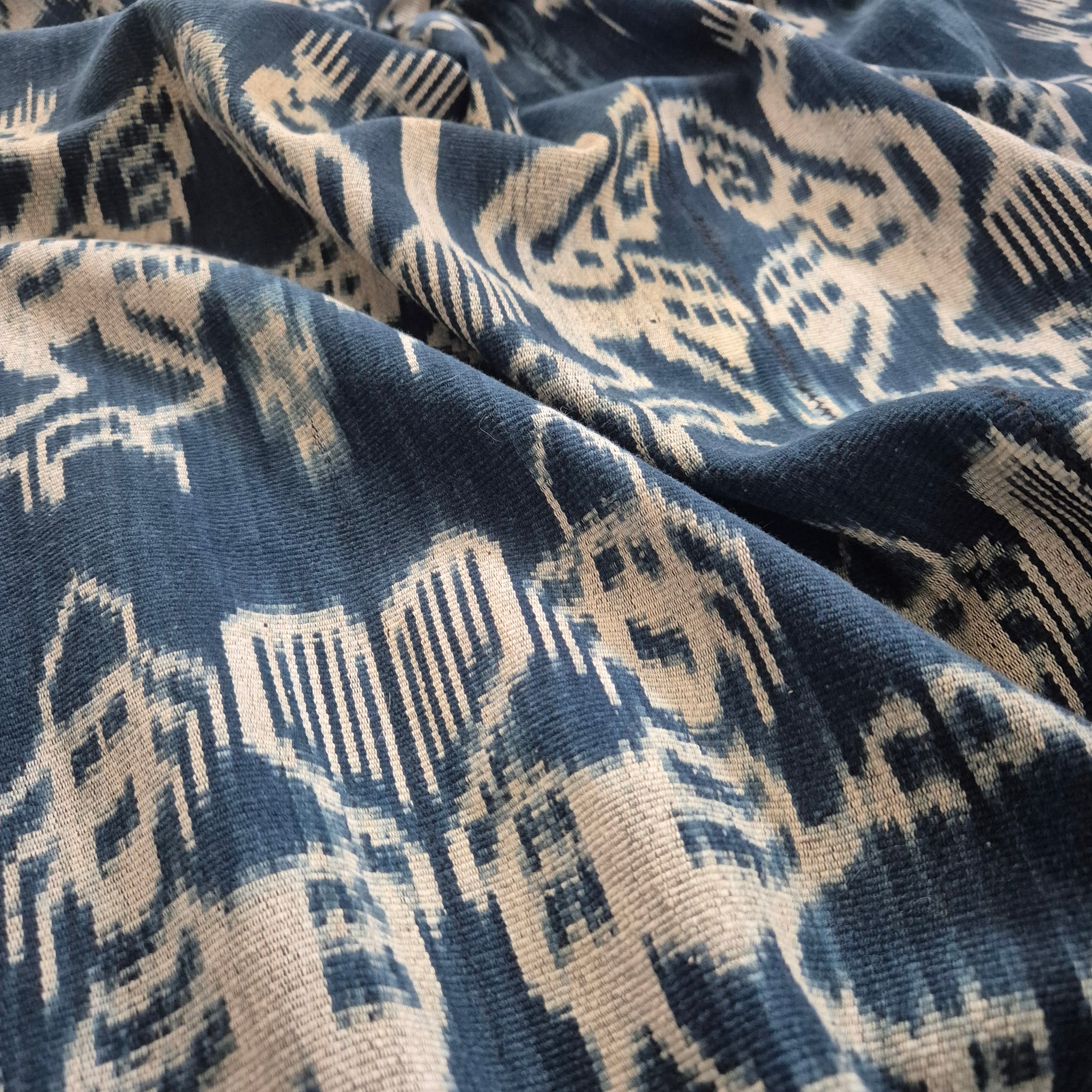 The word ikat comes from a Malay word meaning to tie. The yarn are being tied or bound first, as a form of resist, in the desired pattern and design and then dyed before being woven into textile. Hence the frayed look in the motifs typical of ikat fabriar