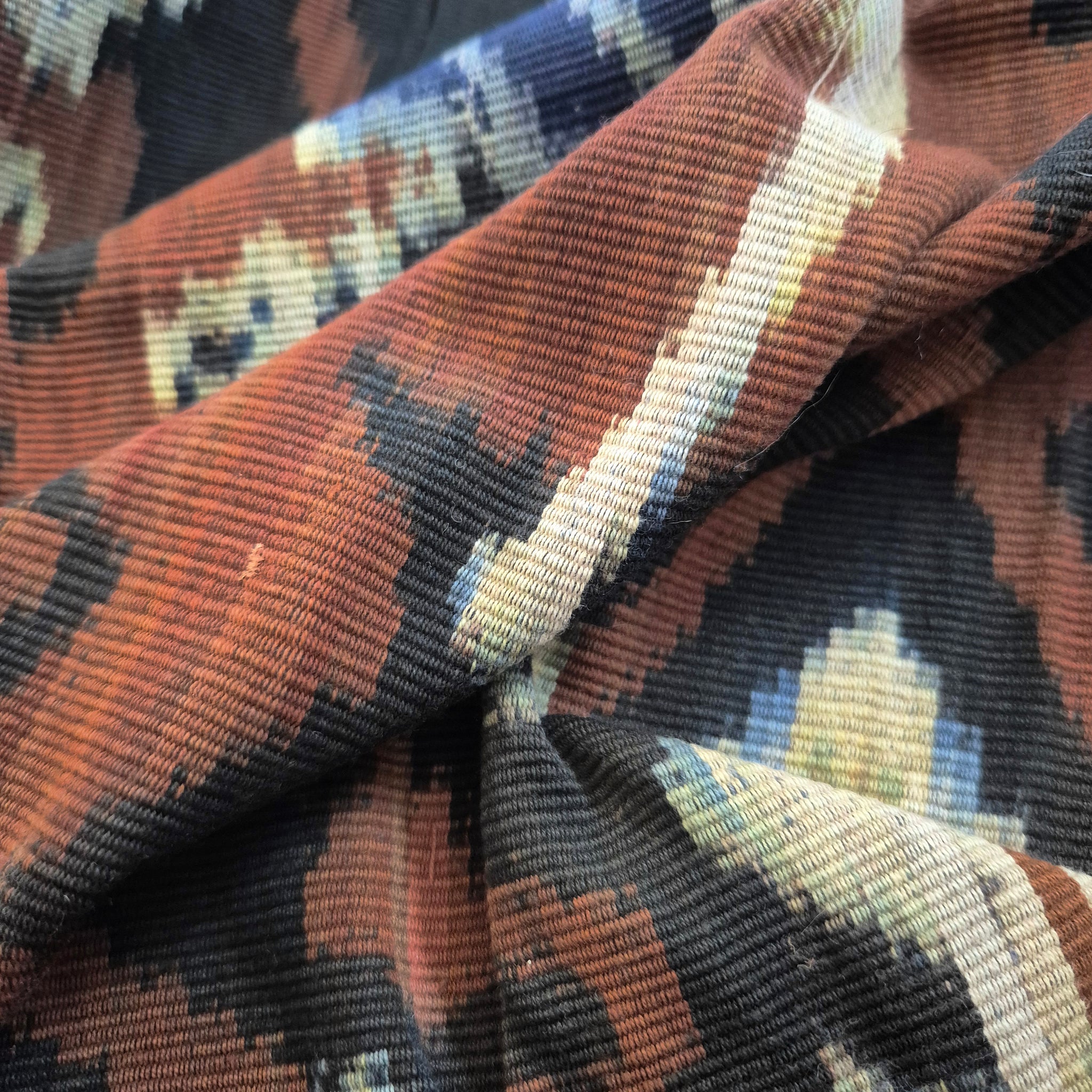 The word ikat comes from a Malay word meaning to tie. The yarn are being tied or bound first, as a form of resist, in the desired pattern and design and then dyed before being woven into textile. Hence the frayed look in the motifs typical of ikat fabric.