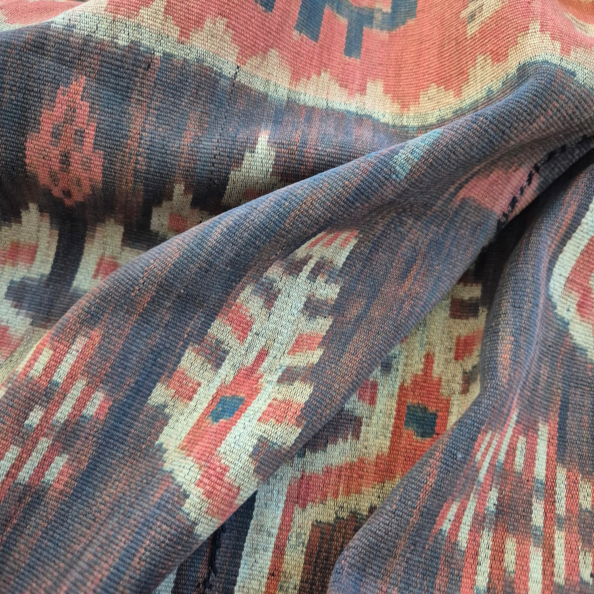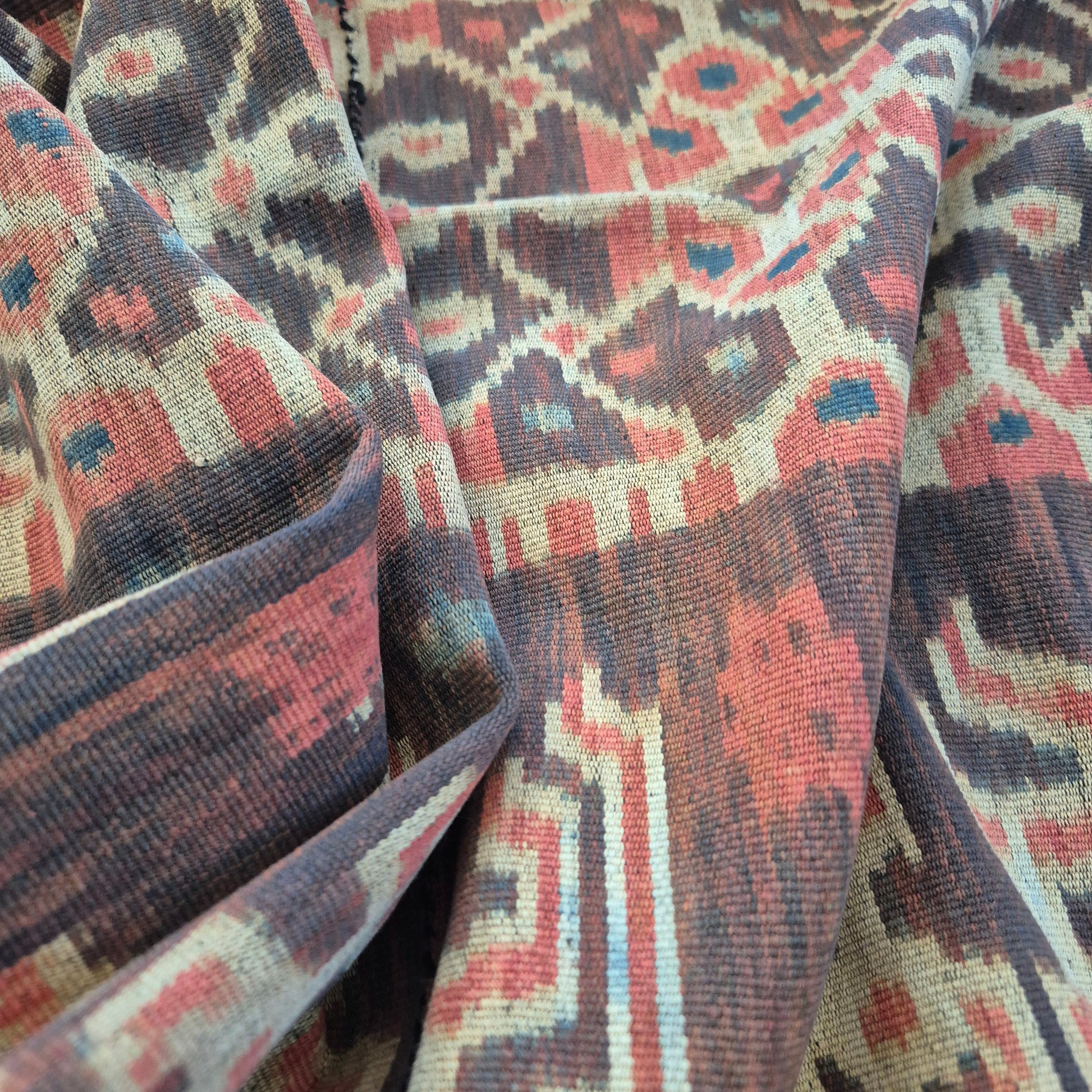 The word ikat comes from a Malay word meaning to tie. The yarn are being tied or bound first, as a form of resist, in the desired pattern and design and then dyed before being woven into textile. Hence the frayed look in the motifs typical of ikat fabric.